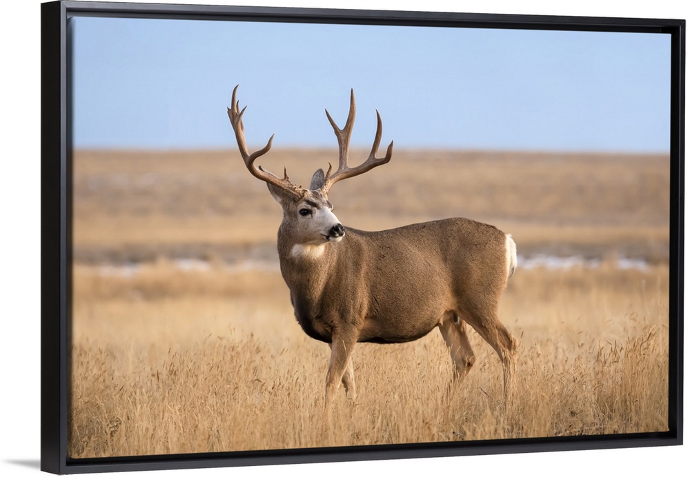 <p>Mule deer buck (Odocoileus hemionus) standing in grass; Steamboat Springs, Colorado, United States of America</p>