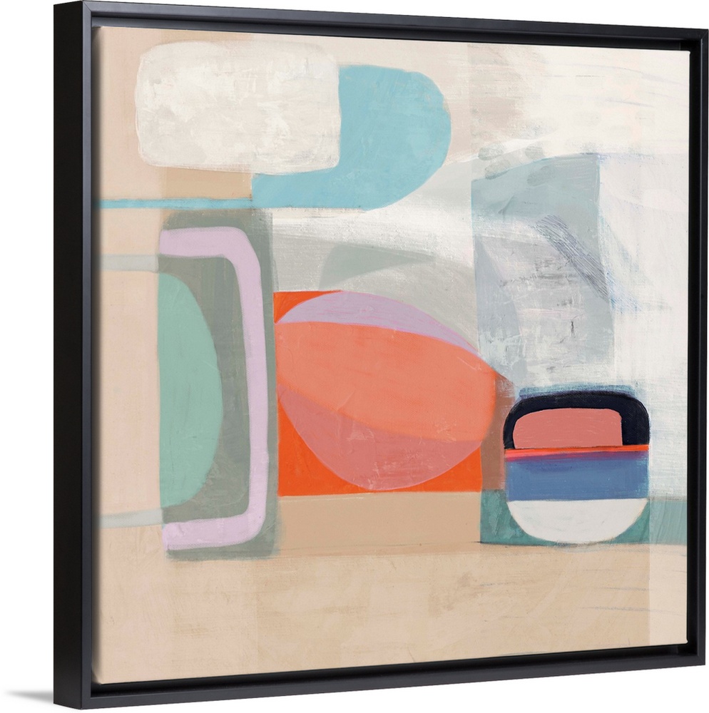 <p>Contemporary artwork of mod shapes in pastel colors on a neutral background.</p>