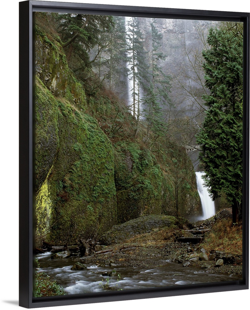<p>Landscape photograph of the Multnomah Falls from a creek side view.</p>