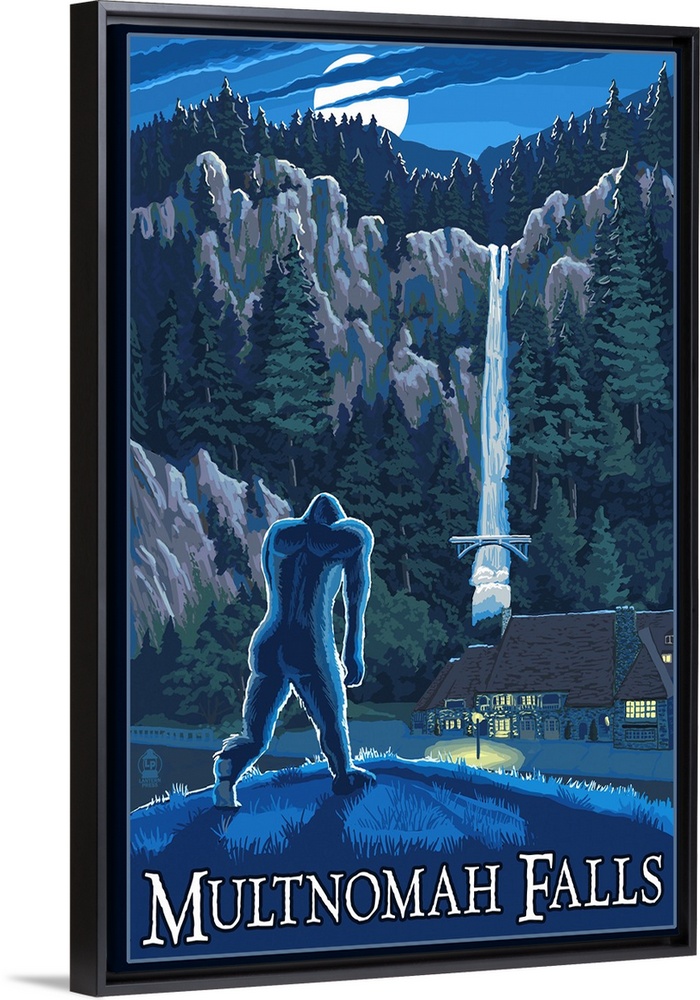 <p>Retro stylized art poster of a silhouetted Sasquatch looking at a waterfall in the moonlight.</p>