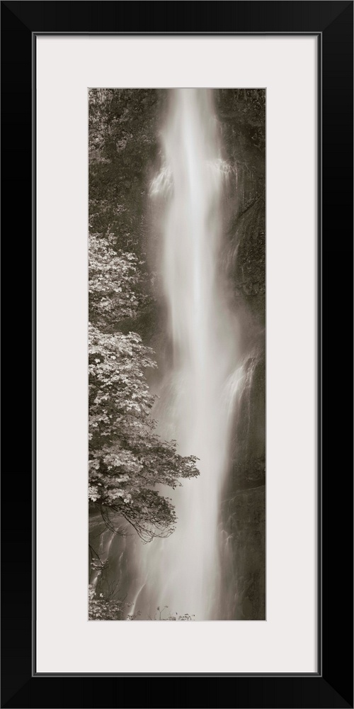<p>A black and white photograph of a waterfall rushing down over over rocks in a forest.</p>