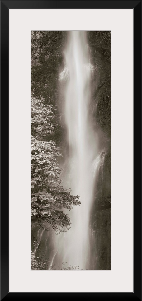 <p>A black and white photograph of a waterfall rushing down over over rocks in a forest.</p>