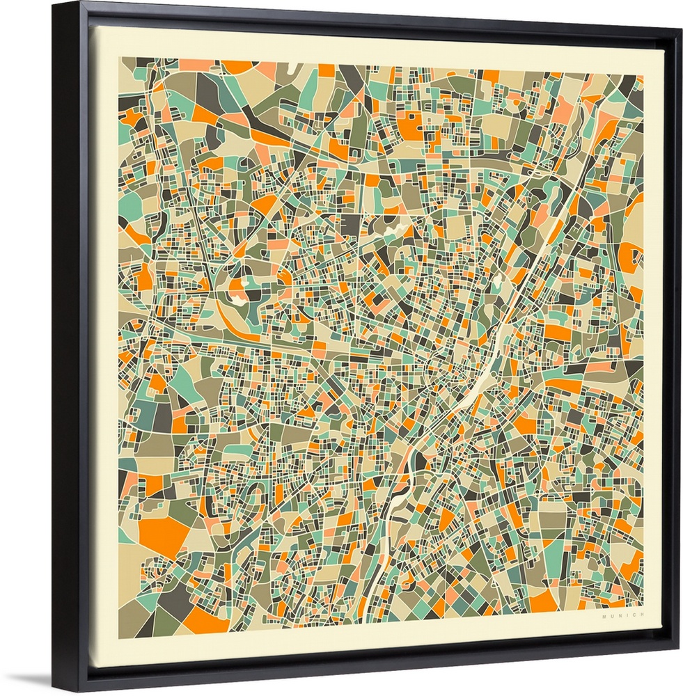 <p>Colorfully illustrated aerial street map of Munich, Germany on a square background.</p>