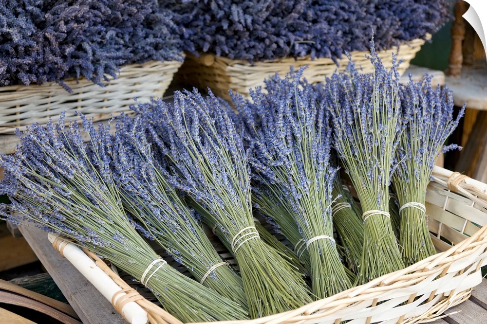<p>Munich, Germany. Farmers market. Basket of dried lavender.</p>