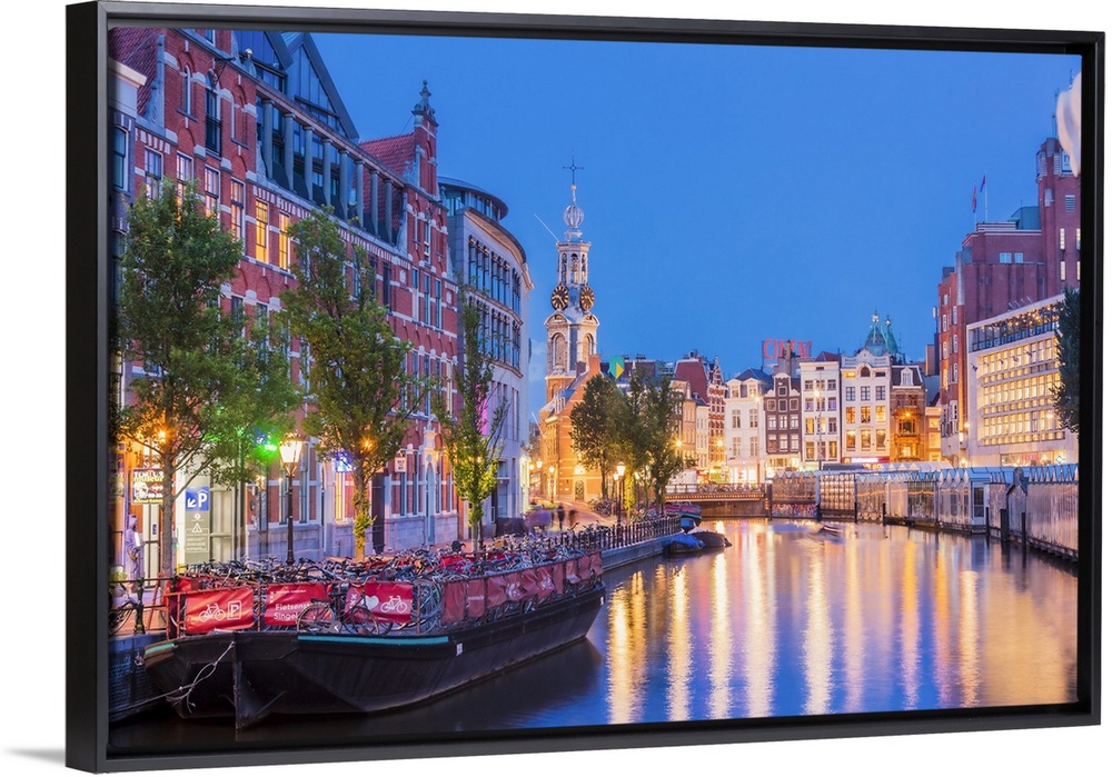<p>Munttoren tower reflecting in the water canal by night in Amsterdam, Holland/Netherlands</p>