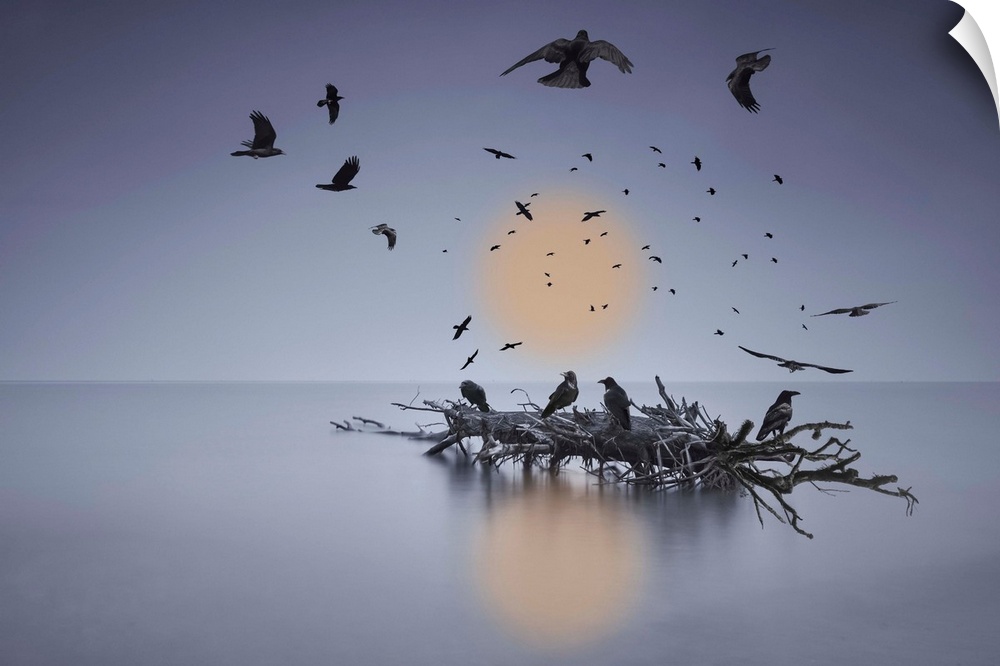 <p>A murder of crows flying or perched on a log in shallow water</p>