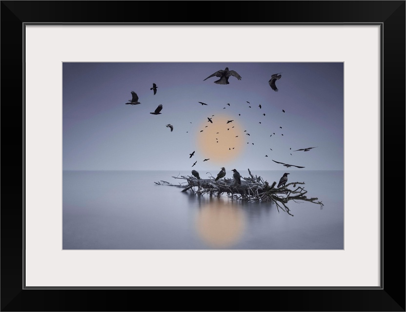 <p>A murder of crows flying or perched on a log in shallow water</p>