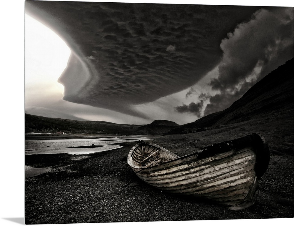 <p>A weathered wooden boat o nthe beach under dark clouds in Iceland.</p>