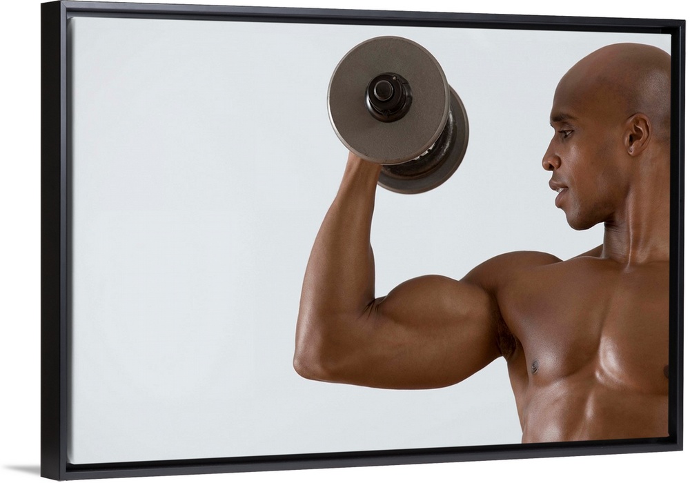 <p>Muscular man lifting dumbbell</p>