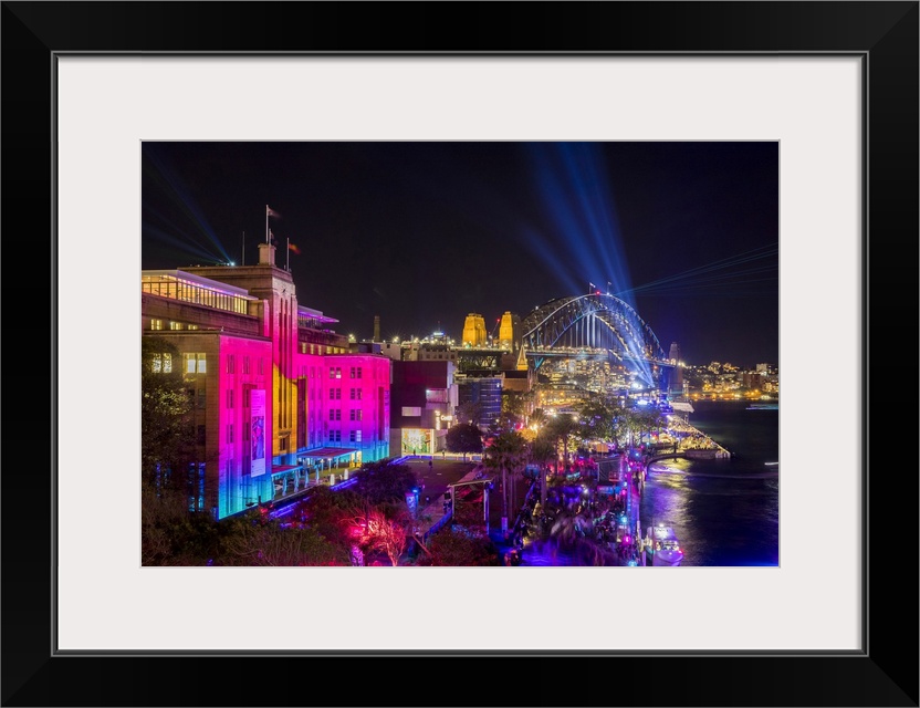 <p>Museum of Contempory Art and Sydney Harbour Bridge illuminated with projections and lasers during Sydney Solstice celebrations, Sydney, New South Wales, Australia.</p>
