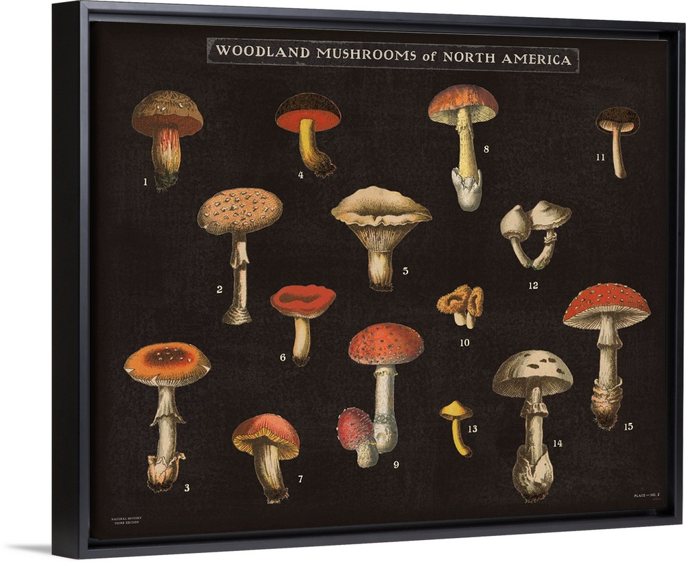 <p>Horizontal Woodland Mushrooms of North America chart with a black background.</p>
