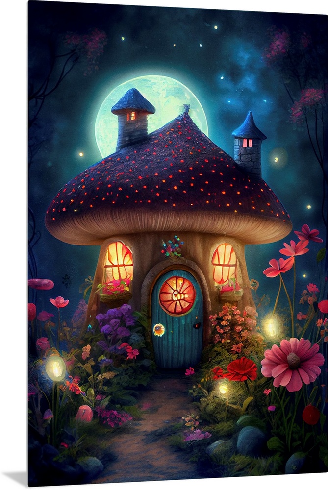 <p>This image by JK Stewart for Duirwaigh Studios is of a mushroom house and garden at night.</p>