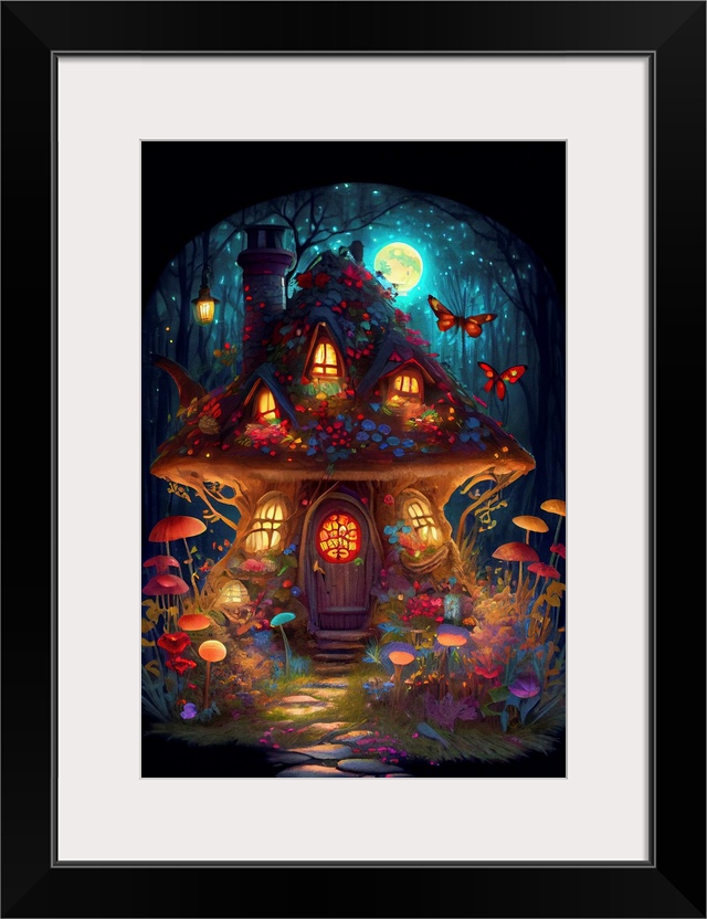 <p>This image by JK Stewart for Duirwaigh Studios is of a mushroom house and garden at night.</p>