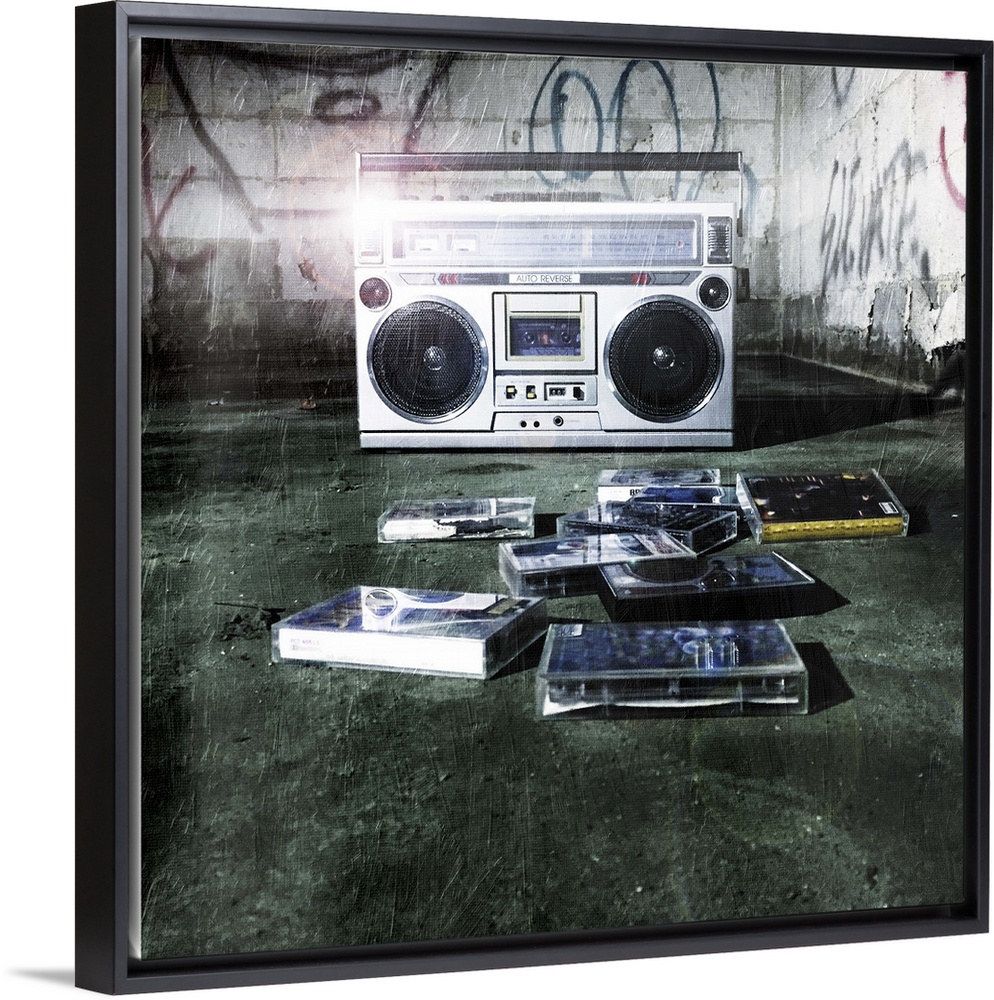 <p>A classic boom box stereo sitting in an abandoned building with old cassette tapes.</p>