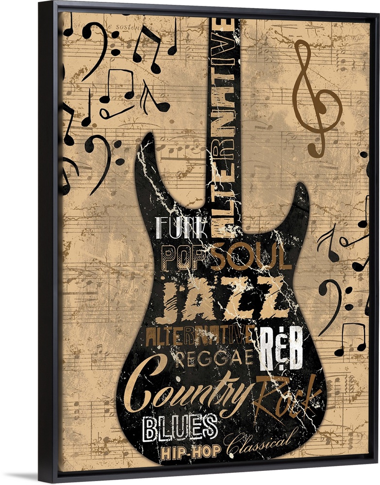 <p>Rustic stenciled guitar with genres of music in the outline of the guitar. With music notes in the background.</p>