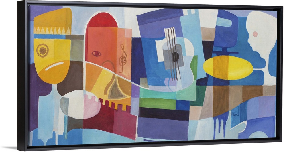 <p>Mark Buku selects a primary palette and a cubist style to explore the many kinds of music. Different instruments send swirling notes across the canvas, linking sounds and listeners. Although the composition seems spontaneous, a horizontal grid bisects the images, and four vertical divisions seem to define separate spaces.</p>