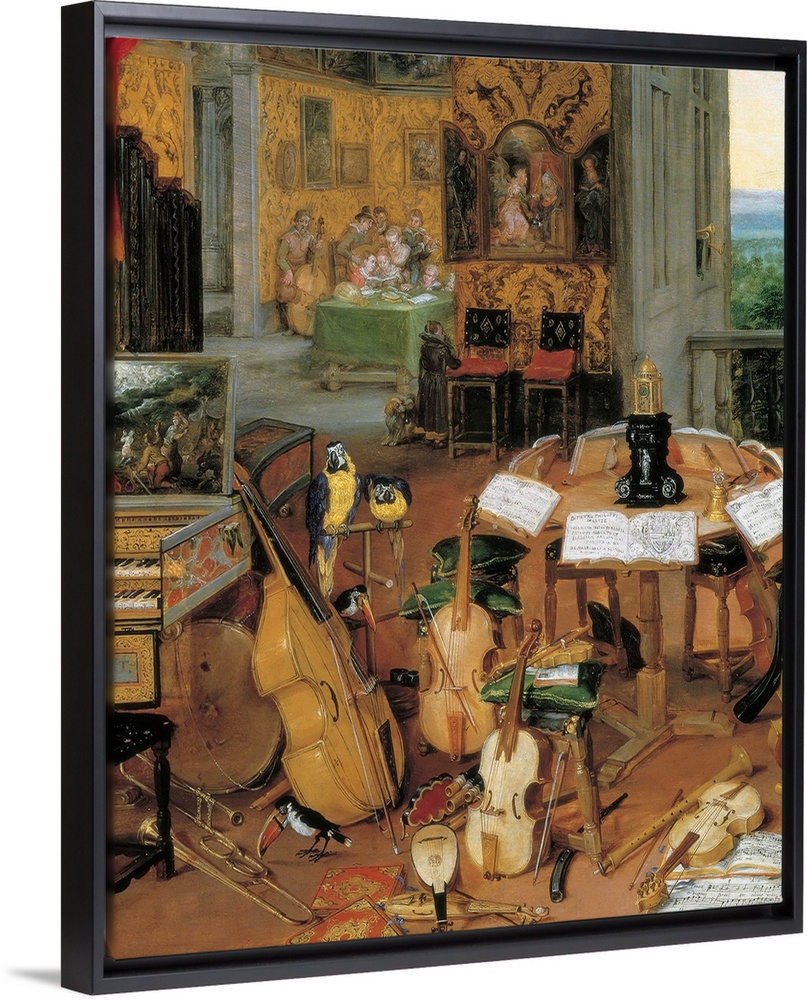 <p>Breugel, Jan, The Elder, called Velvet Bruegel (1568-1625). Hearing. 1617 - 1618. Detail of the musical instruments. On the table, the book Madrigali a sei voci of Pietro Philipp Inlese, organist of the Archdukes. Baroque art. Oil on wood. SPAIN. Madr</p>