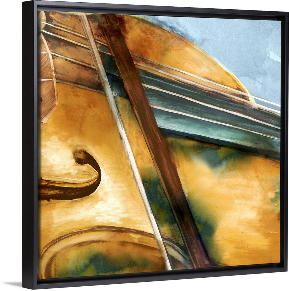 <p>Contemporary watercolor painting of part of a violin and bow close-up on a square blue-gray background.</p>