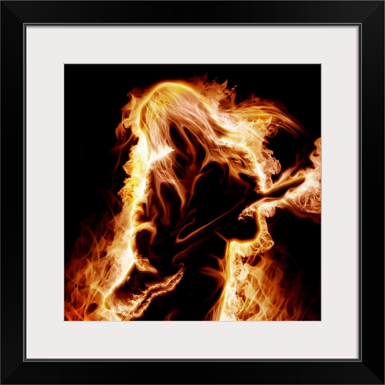 <p>Musician with an electronic guitar enveloped in flames on a black background</p>