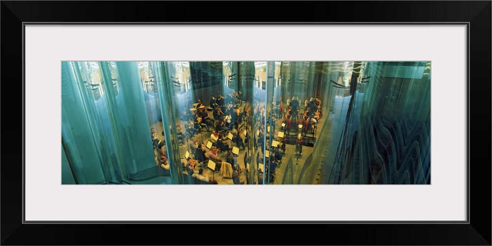 <p>Photograph taken through a curvy glass design of musicians playing in a concert hall.</p>