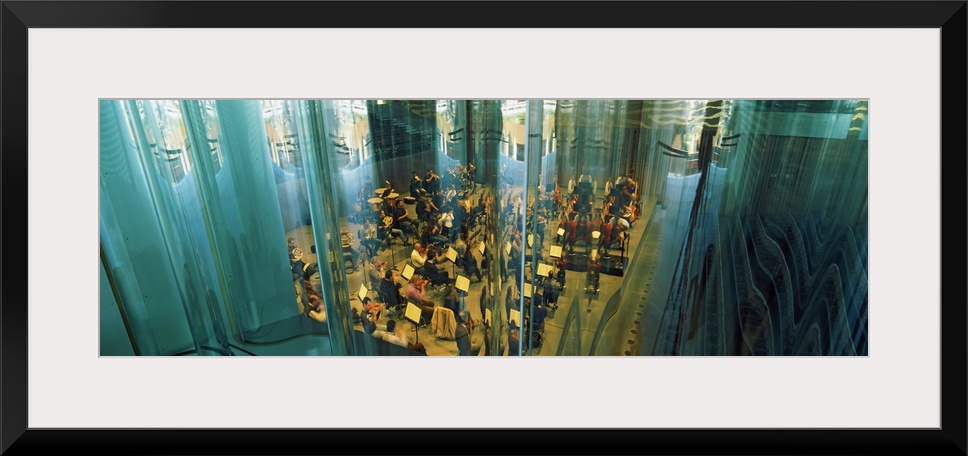 <p>Photograph taken through a curvy glass design of musicians playing in a concert hall.</p>