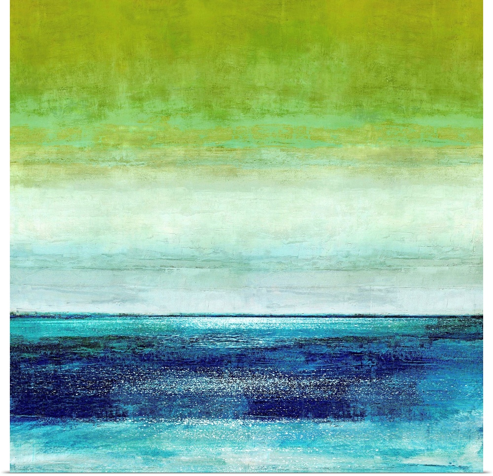 <p>Square abstract painting with horizontal brushstrokes from top to bottom in shades of green, blue, and white.</p>