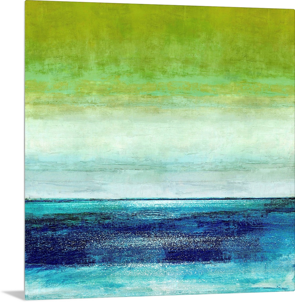 <p>Square abstract painting with horizontal brushstrokes from top to bottom in shades of green, blue, and white.</p>