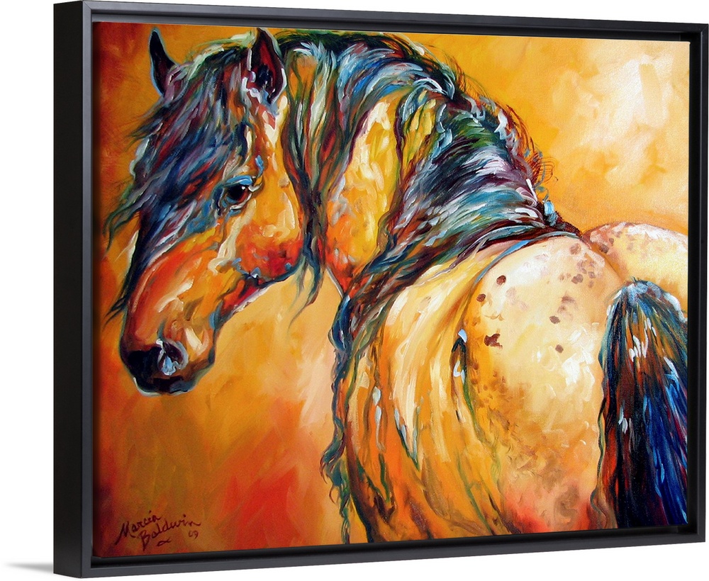 <p>Contemporary painting of horse in warm orange, yellow, and red tones with cool colors in its mane.</p>