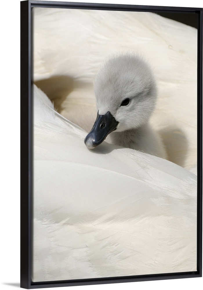 <p>Mute Swan (Cygnus olor) cygnet, on back of adult female, Abbotsbury, Dorset, England</p>