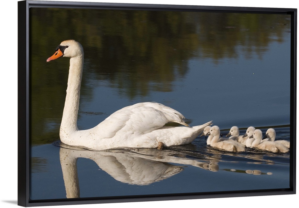 <p>mute swan (Cygnus olor) swimming with young, Kensington Metro Park, MI</p>