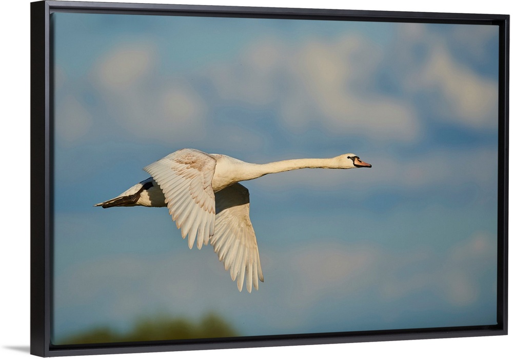<p>Mute swan flying in the sky with coloured clouds, Bavarian Forest, Bavaria, Germany</p>