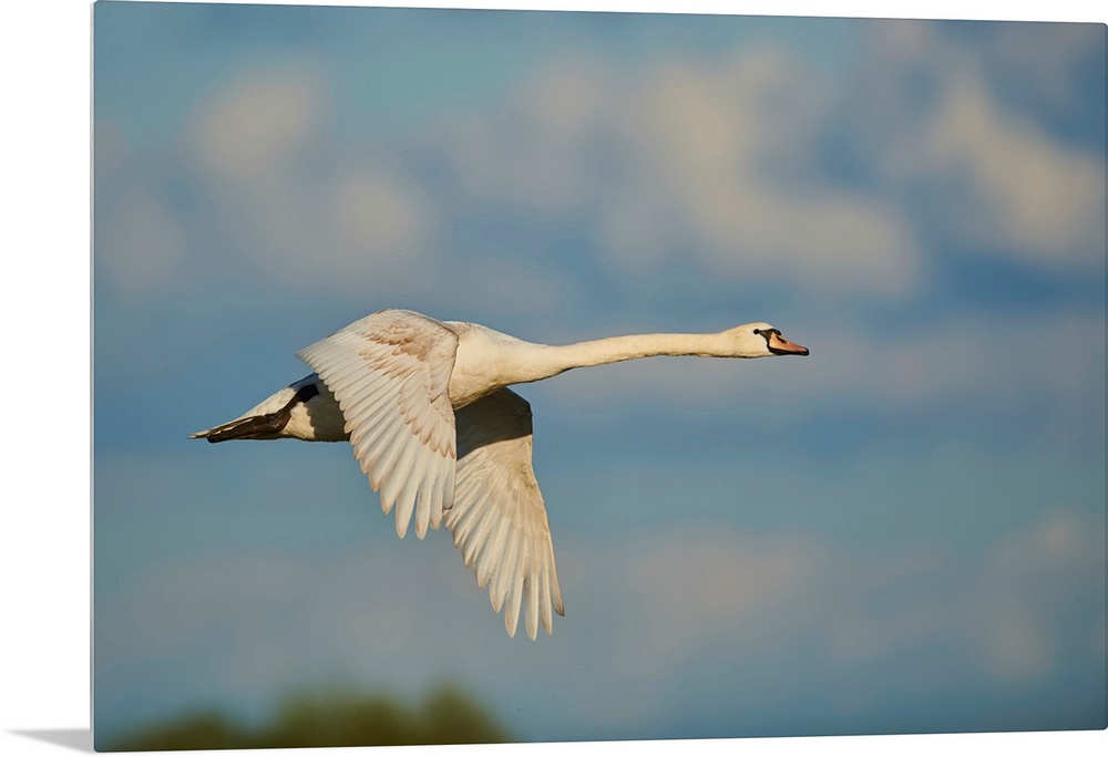 <p>Mute swan flying in the sky with coloured clouds, Bavarian Forest, Bavaria, Germany</p>
