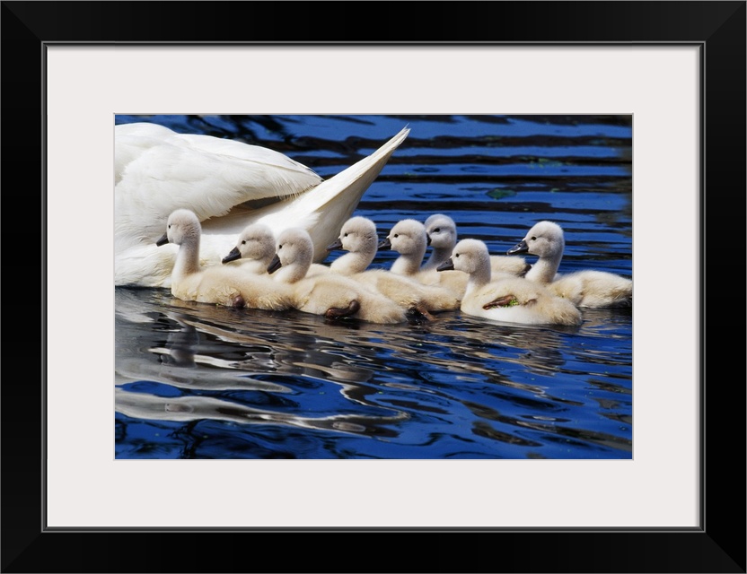 <p>The back of a swan is photographed as its babies follow closely in the water.</p>