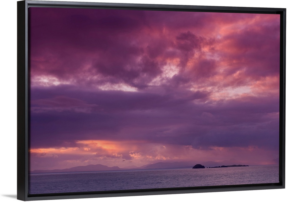 <p>Fine art photo of a dramatic skyscape over a calm ocean with a small island in the distance.</p>