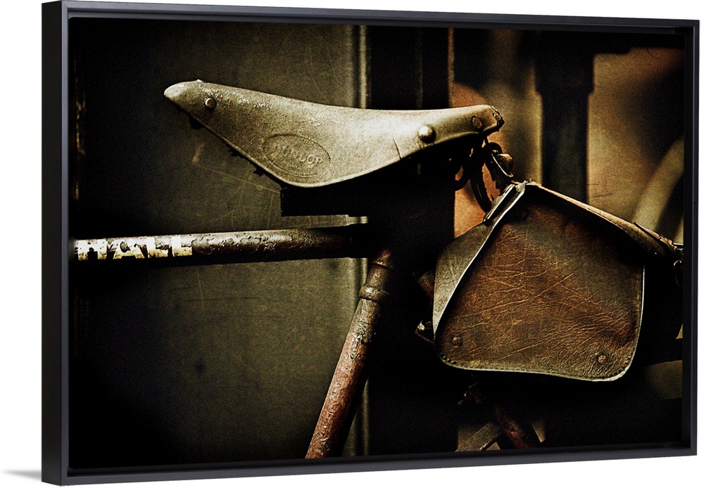 <p>A close up of an old bicycle with a worn leather saddle and saddle bag in sepia tones.</p>