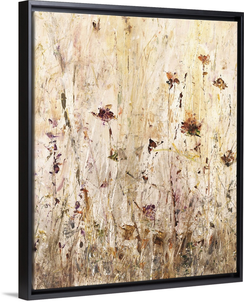 <p>Contemporary abstract painting of flowers and tall grass in earthy tones.</p>