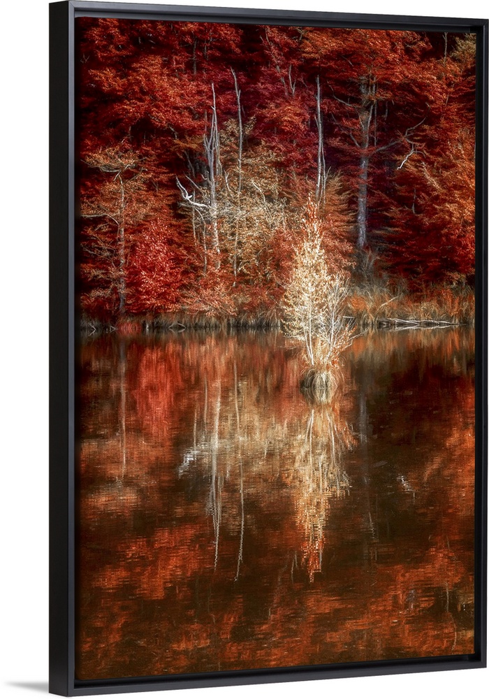 <p>A forest of trees with bright red fall leaves reflected in the water.</p>