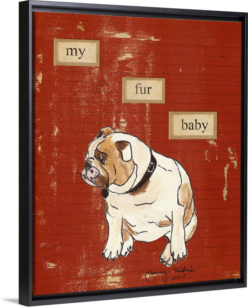 <p>Drawing of a bulldog with cut-out words on a striped background.</p>