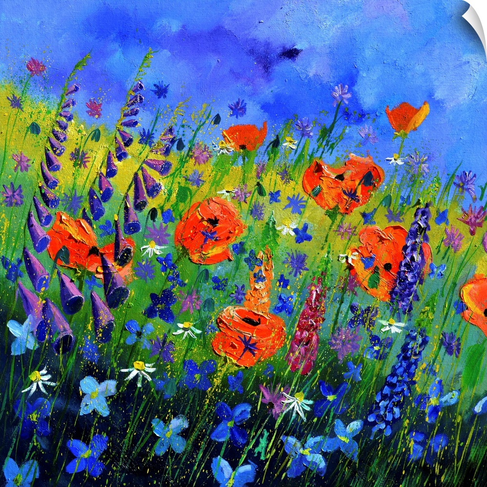 <p>Square painting of colorful flowers in a garden and a bright blue sky with small speckles of paint overlapping.</p>