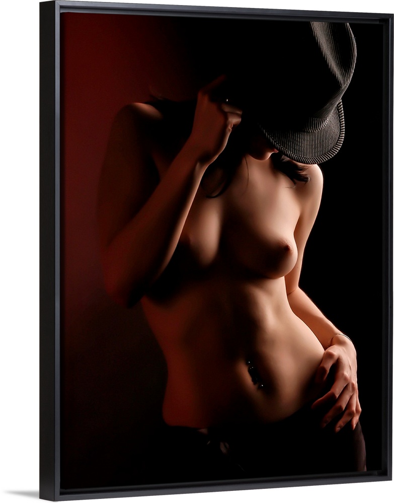<p>A portrait of a nude woman cast in dynamic shadow with a hat covering her face.</p>