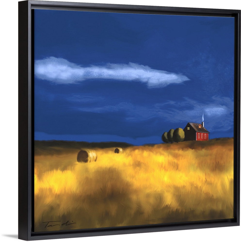 <p>Painting of a red farmhouse in a wheat field with hay bales.</p>