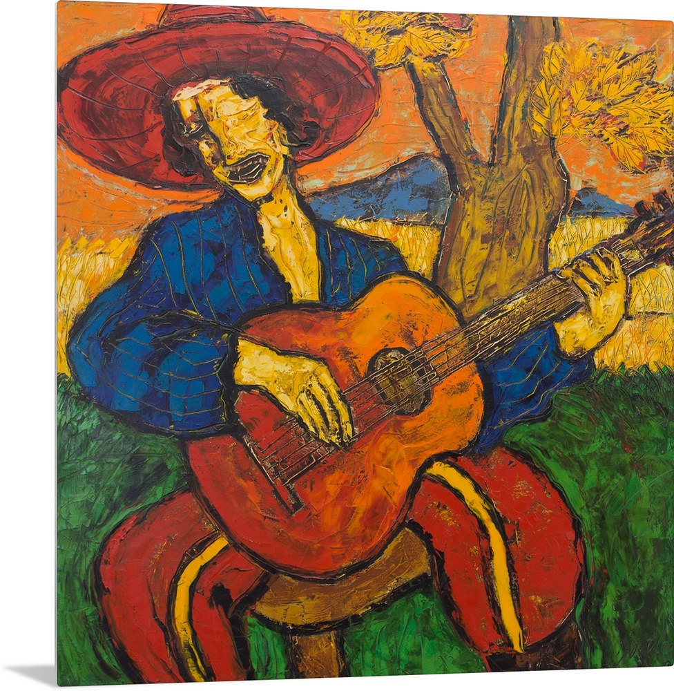 <p>Seated beneath a shade tree, a man strums his guitar and lifts his voice in song. 'This is a man with his old guitar, one of his best friends in life,' artist Joel Mangundirjo explains. A vibrant palette of primary hues envelops the image in beauty.</p>