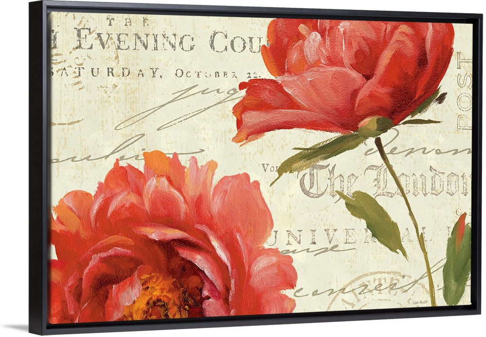 <p>Two painted peony blossoms fill this home docor with cheer and text embellishments in the background give this wall art depth.</p>