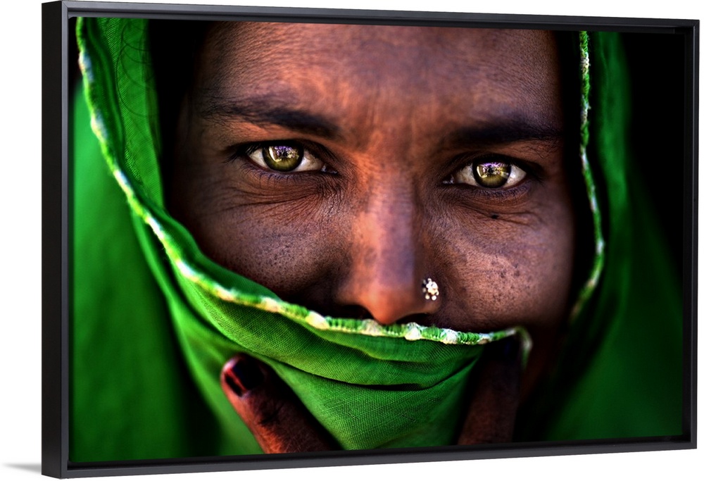 <p>A portrait of a woman with most of her face covered by a green wrap.</p>