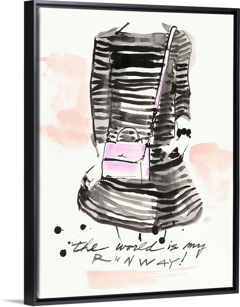 <p>Watercolor fashion artwork of a woman wearing a striped dress and a pink purse.</p>