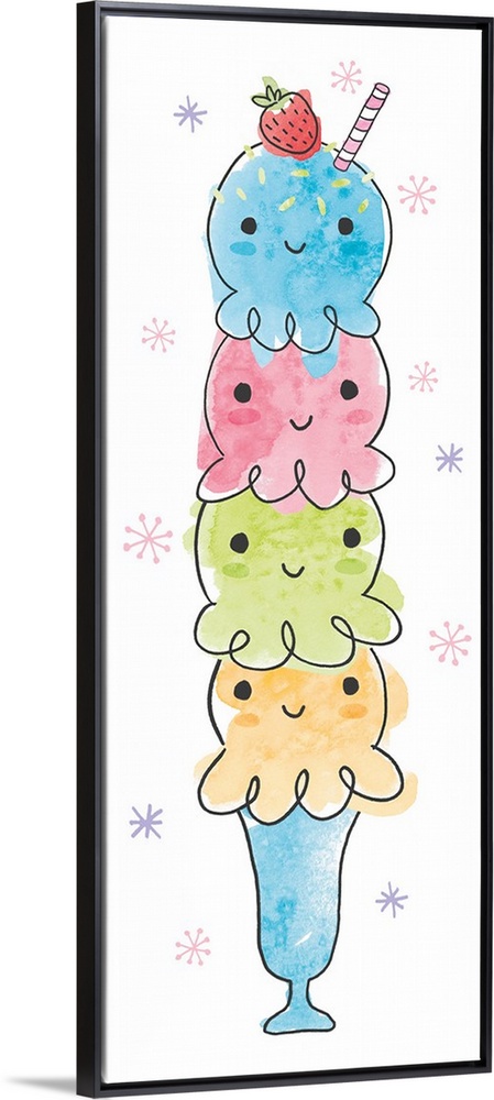 <p>Tall and skinny vertical watercolor painting of an ice cream milkshake with four different colored scoops and a strawberry on top.</p>