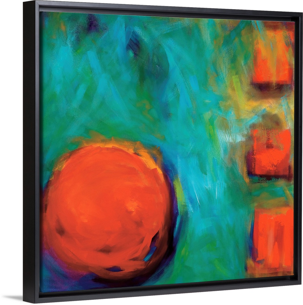 <p>Abstract square painting of a large circle and three small squares on the right in orange surrounded by a textured blue/green backdrop.</p>