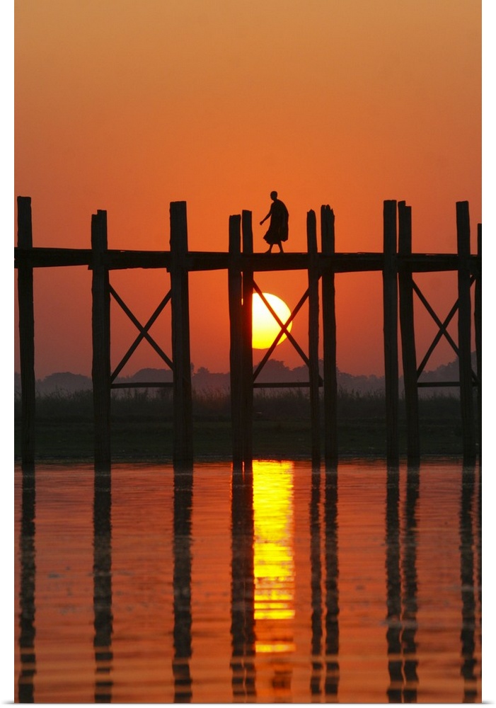 <p>Myanmar (Burma), Amarapura, Taungthaman Lake, U Bein's Bridge. A monk walking home at sunset over U Bein's Bridge, over 200 years old and the world's longest teak span.</p>