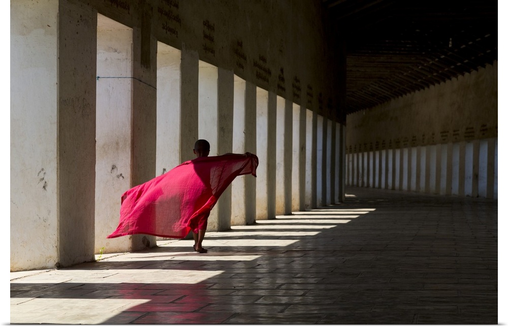 <p>Myanmar, Mandalay, Bagan, Novice monk walking along the covered entrance to Schwezigon Paya.</p>