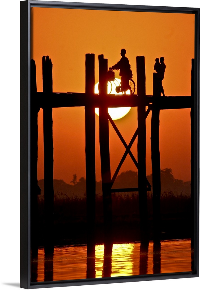 <p>Myanmar, Burma, Amarapura, Taungthaman Lake, U Bein's Bridge. A family walking home at sunset over U Bein's Bridge, over 200 years old and the world's longest teak span.</p>